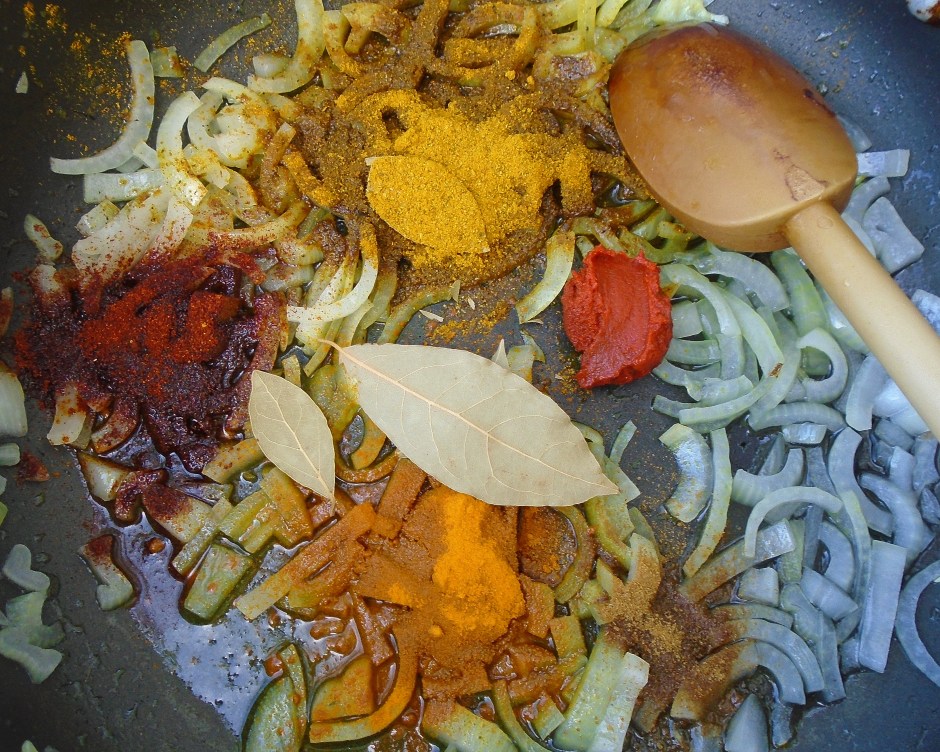 Goan Chicken Curry ← Previous Next → add 3 bay ea leaves, 1 tblsp tomato paste, 3 tblsp curry pwd, 1 tsp paprika, 1/4 tsp ground coriander, 1 tsp turmeric, 1/4 tsp cumin, 1/4 tsp and 1/2 tsp crushed mustard seeds, saute until fragrant