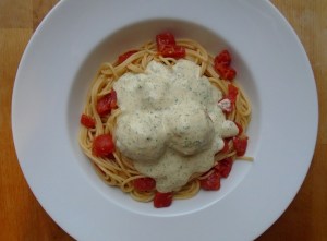 - divide pasta into 2 deep plates