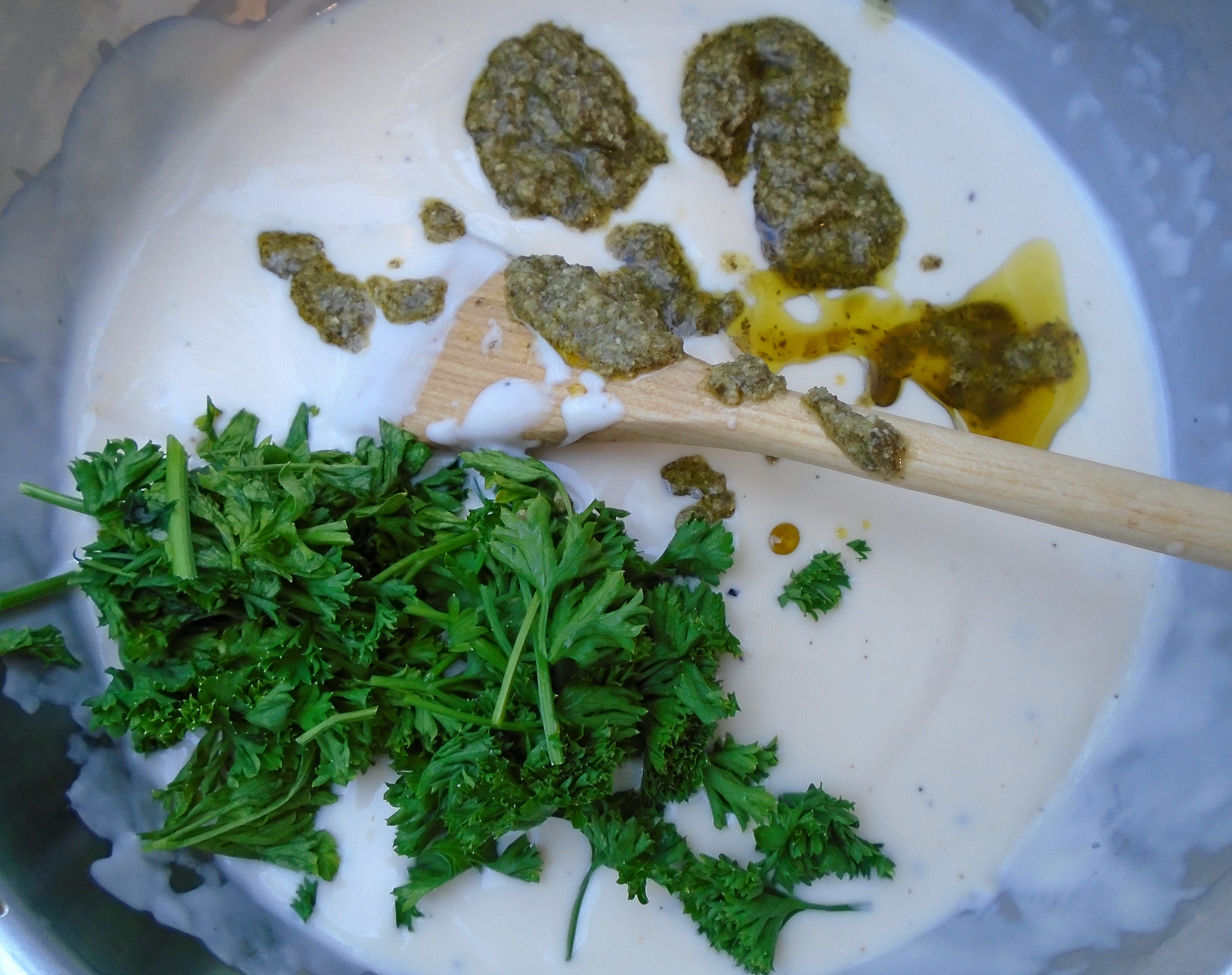 add a few sprigs of curly parsley and 3 tblsp pesto