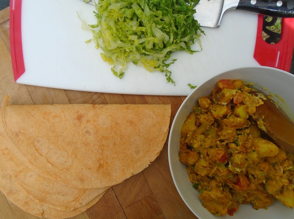 Curried Garbanzo And Potato Wrap With Raita ← Previous Next → slice 1 small head of romaine lettuce into julienne