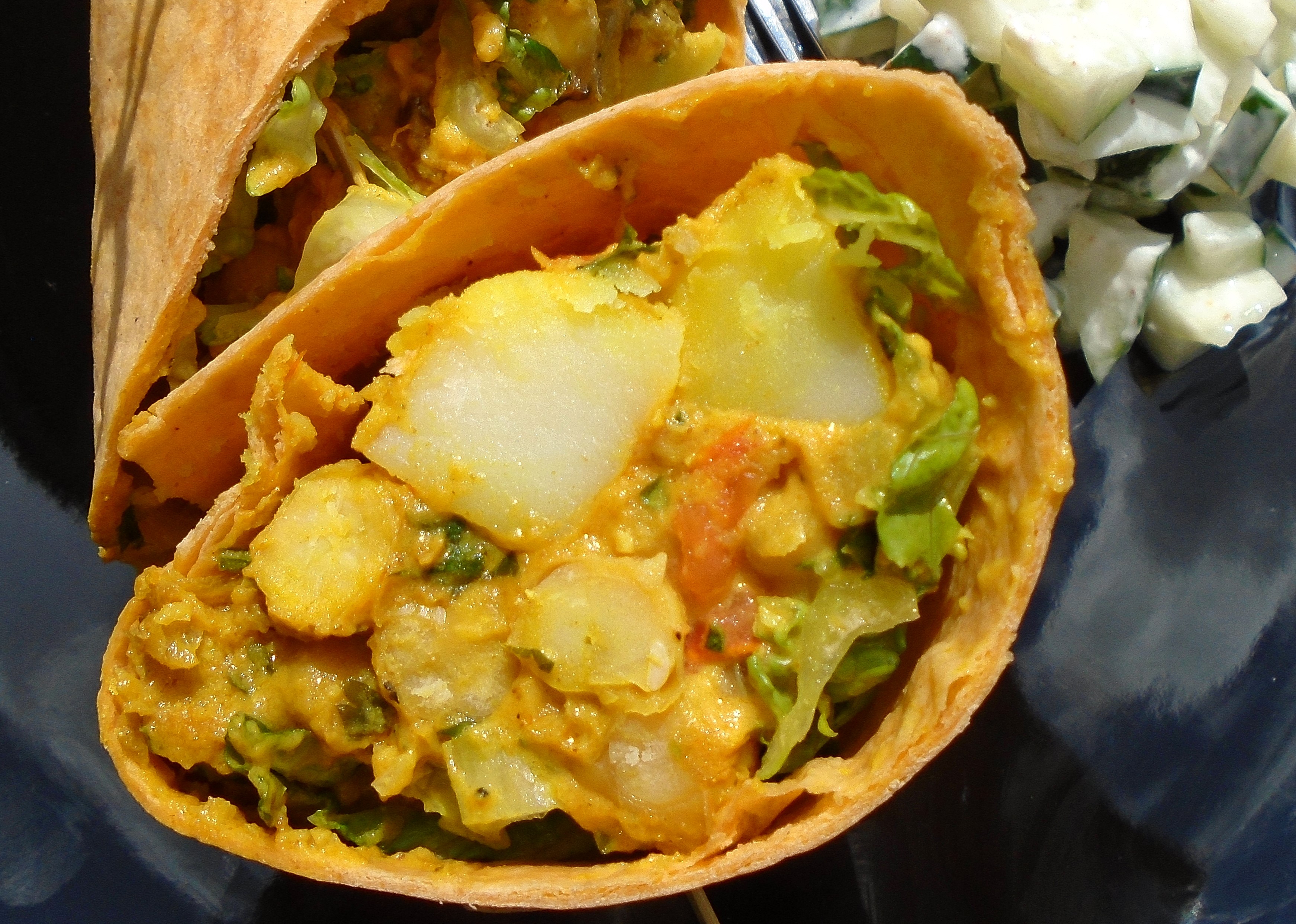 Curried Garbanzo And Potato Wrap With Raita ← Previous Next → Curried Garbanzo And Potato Wrap With Raita