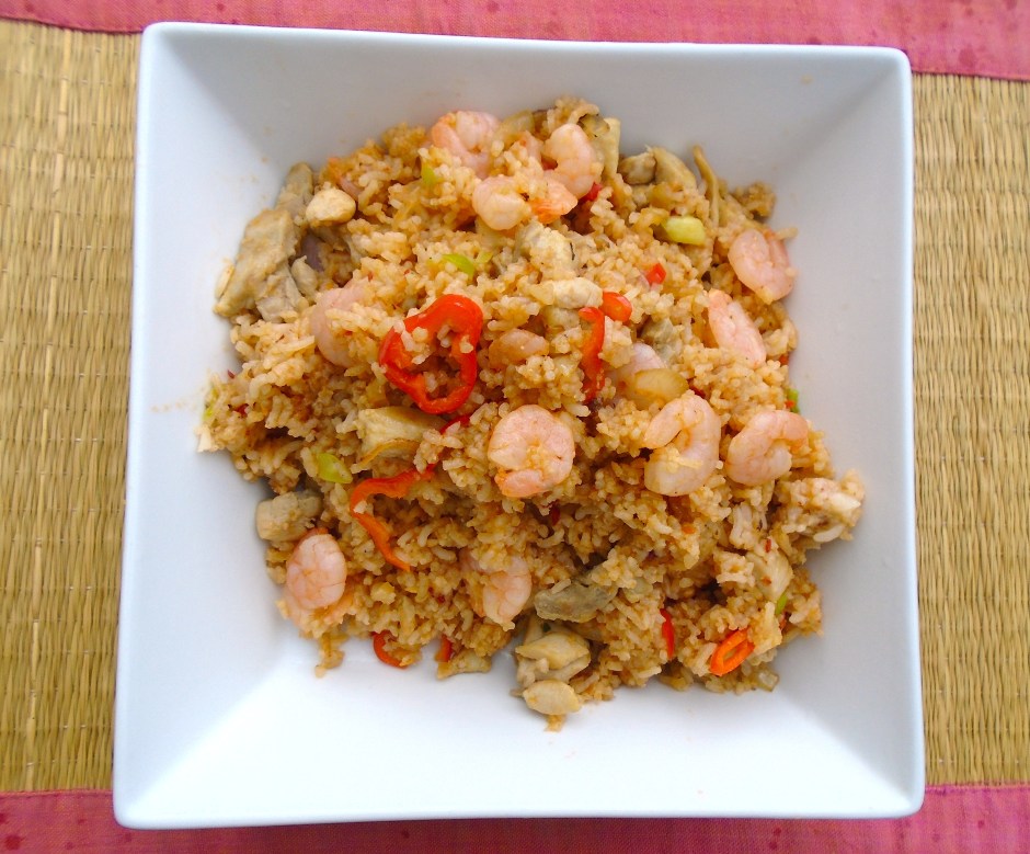 Nasi Goreng ← Previous Next → add kosher salt and cayenne pepper to taste, stir fry until well mixed and the rice starts to “pop”, check/adjust seasoning; put the nasi goreng on a serving dish, sprinkle with fried shallots
