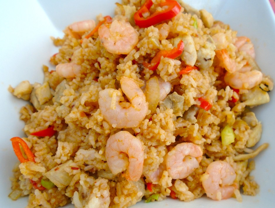 Nasi Goreng ← Previous Next → top nasi goreng with 3 fried eggs, sprinkle with chili flakes and sliced scallions; serves 3