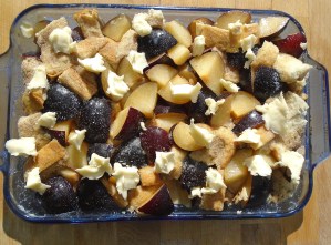 - cut 10 THICK slices of day-old white bread into large cubes, mix with the plums, fill into ovenproof dish