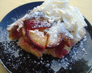 - bake pudding at 375F until set and plums are soft and top is caramelized, about 45 minutes, remove from oven, let slightly cool; sprinkle with castor sugar and serve with whipped cream; serves 8