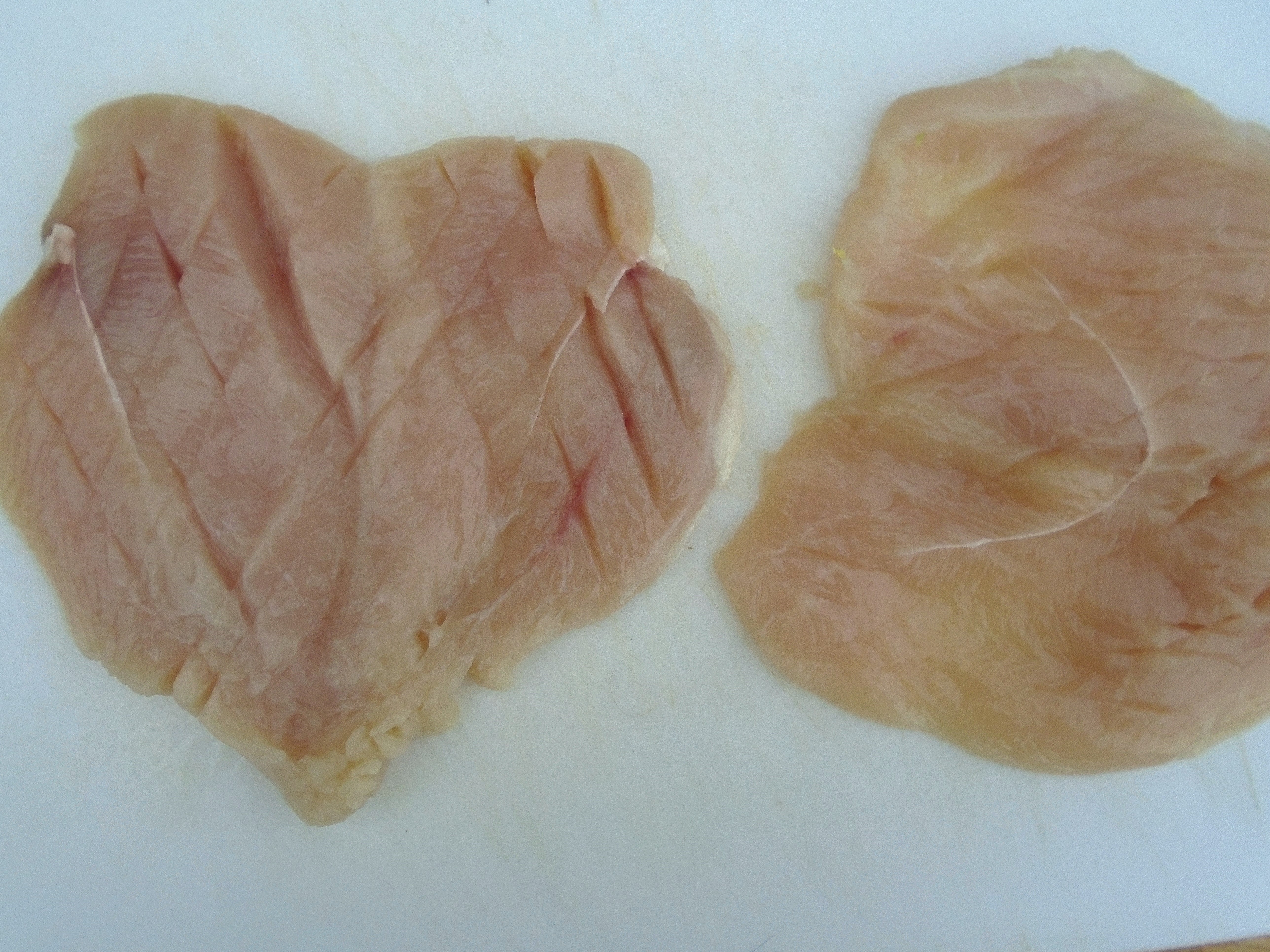 cut the 8 oz breasts horizontally into 4 cutlets, score lightly to avoid shrinkage