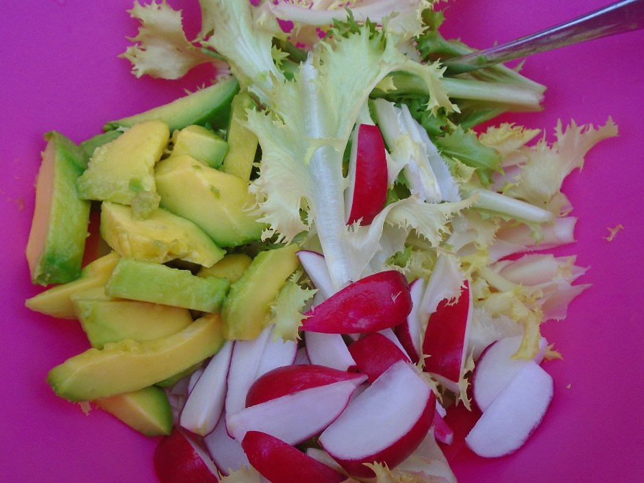 a ← Previous Next → peel and cut 1 medium size avocado into bite-size pieces, cut 6 ea red radishes into wedges, add the heart of 1 small endive and 2 oz of yogurt dressing