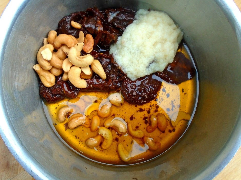 Pasta With Sundried Tomato/Cashew Pesto And Ricotta Next → to 1 cup sun dried tomatoes preserved in olive oil add 1/2 cup olive oil, 1/4 cup salted cashew nuts, 2 tblsp garlic paste, kosher salt and cayenne pepper to taste