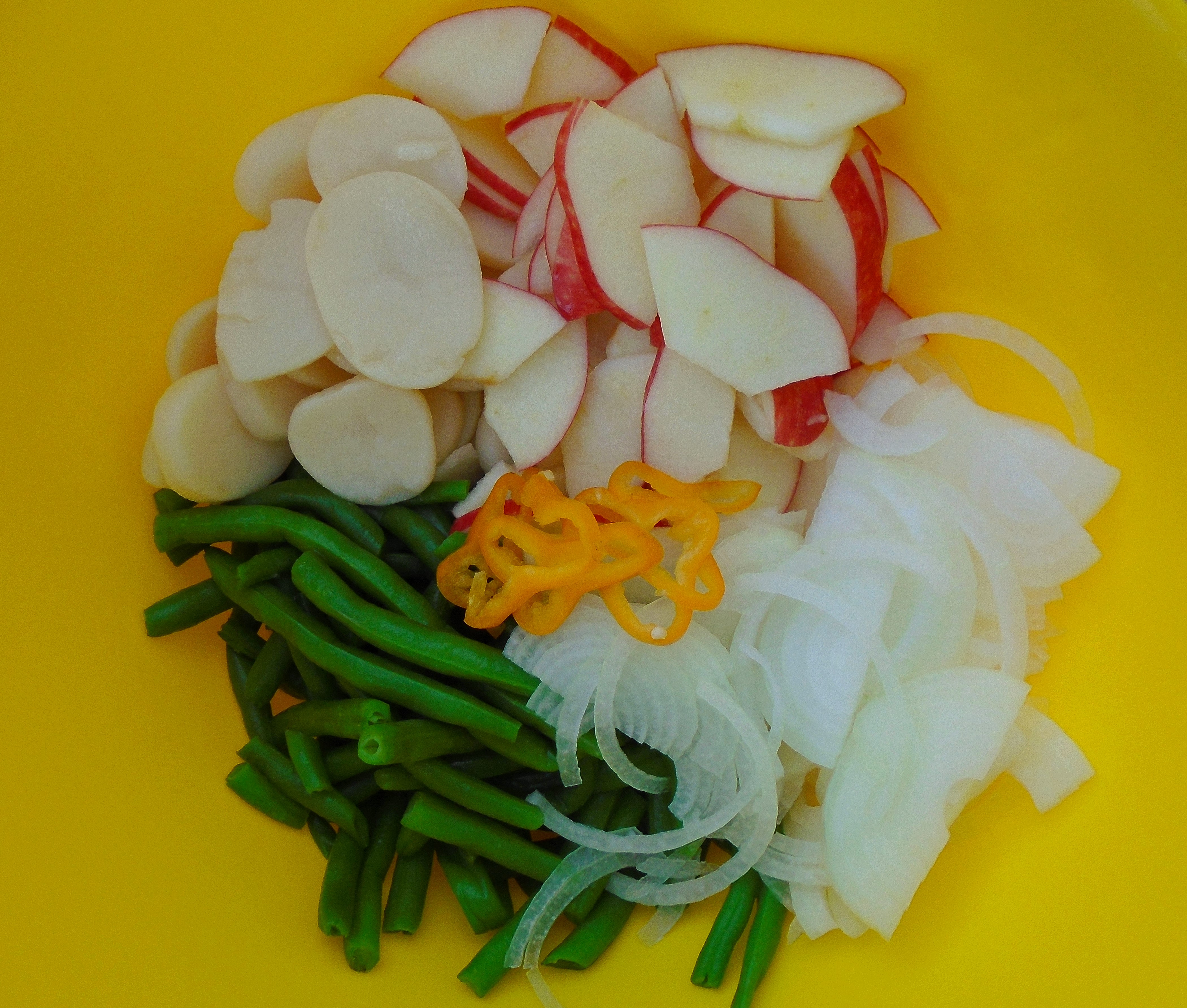 Bratwurstsalat ← Previous Next → core and slice 1 ea red apple into fine slices, add two packed cups of fresh-cooked green beans, 2 cups cooked, sliced potatoes, 1 medium size sliced onion and 1 finely sliced yellow medium-hot chili