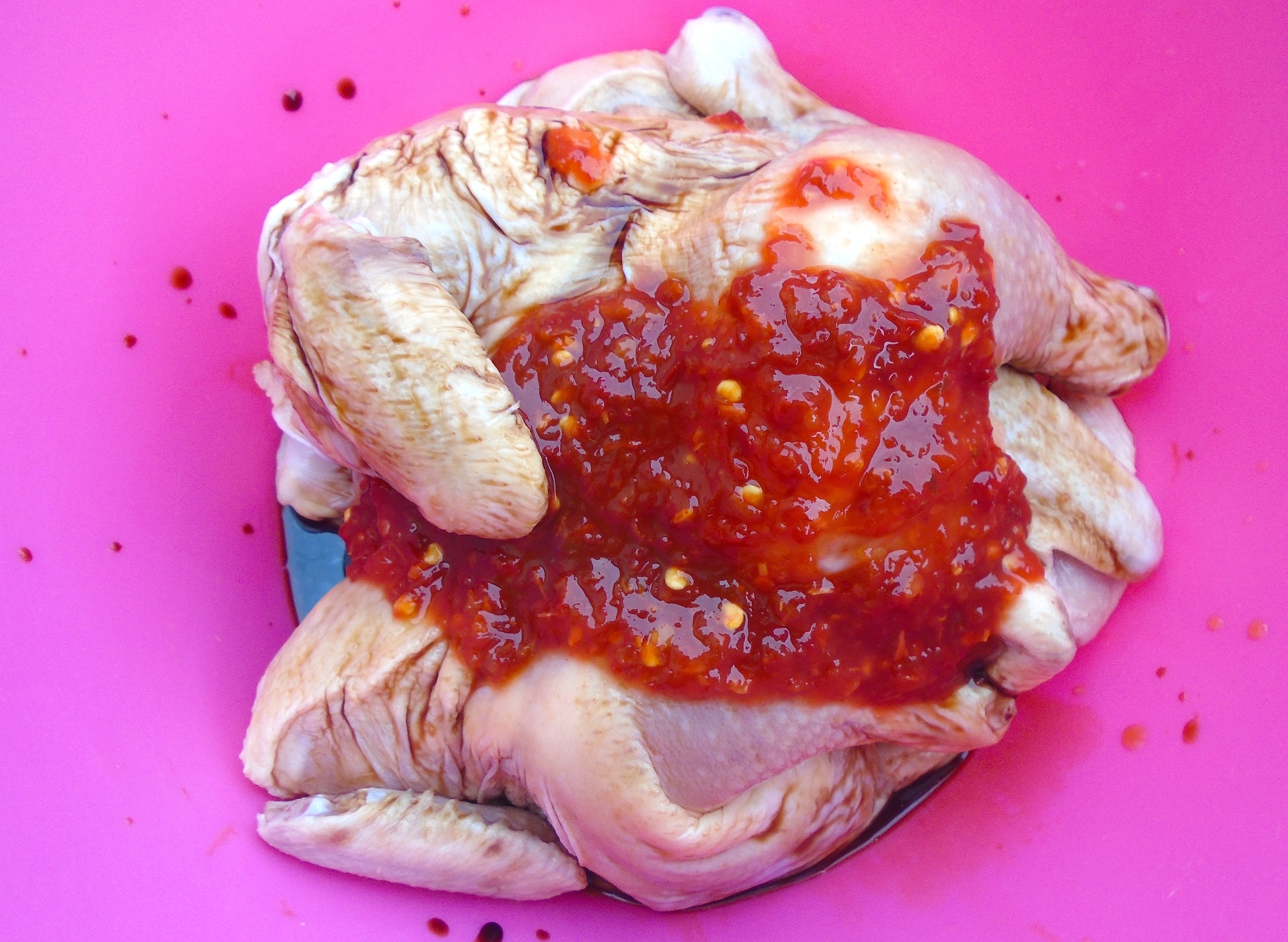 Ginger And Soy Braised Cornish Hens With Cucumber Pickles ← Previous Next → season with 2 tblsp chili paste, 1/2 tblsp garlic paste, 1 tblsp soy sauce, 1 tblsp hoi sin sauce,1 tsp grated ginger and kosher salt to taste
