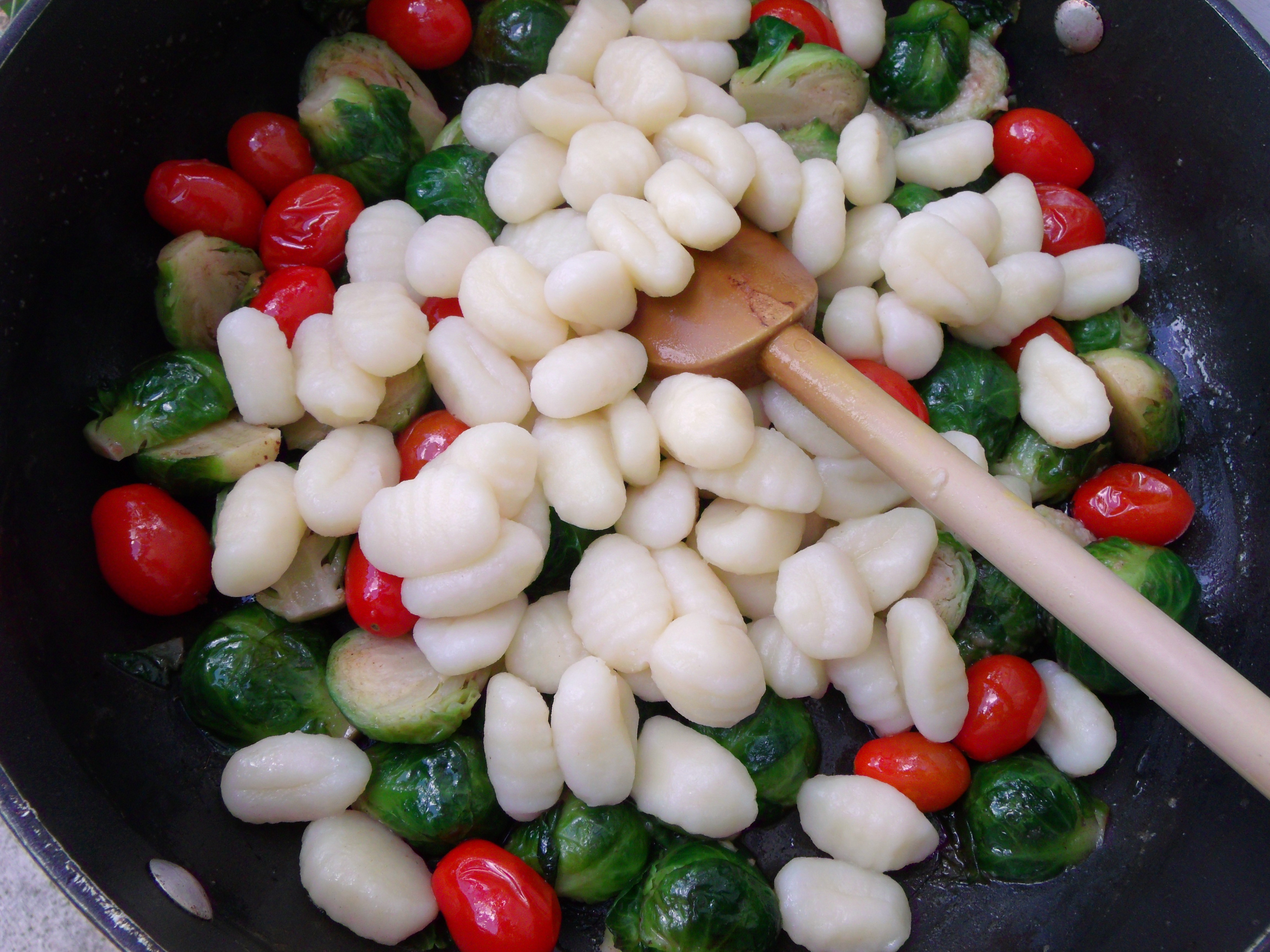 Gnocchi, Brussel Sprouts And Grape Tpmatoes “Almondine” ← Previous Next → add 16 oz fresh-cooked gnocchi, season with kosher salt, cayenne pepper and grated nutmeg to taste