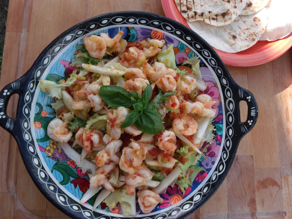 Salad Of Chili Shrimp, Chicorée Frisée, Pear And Sun-Dried Tomato (Or Is It A Taco ?) ← Previous Next → top the salad with the shrimp and its juices; serves 2 main courses or 6 appetizers