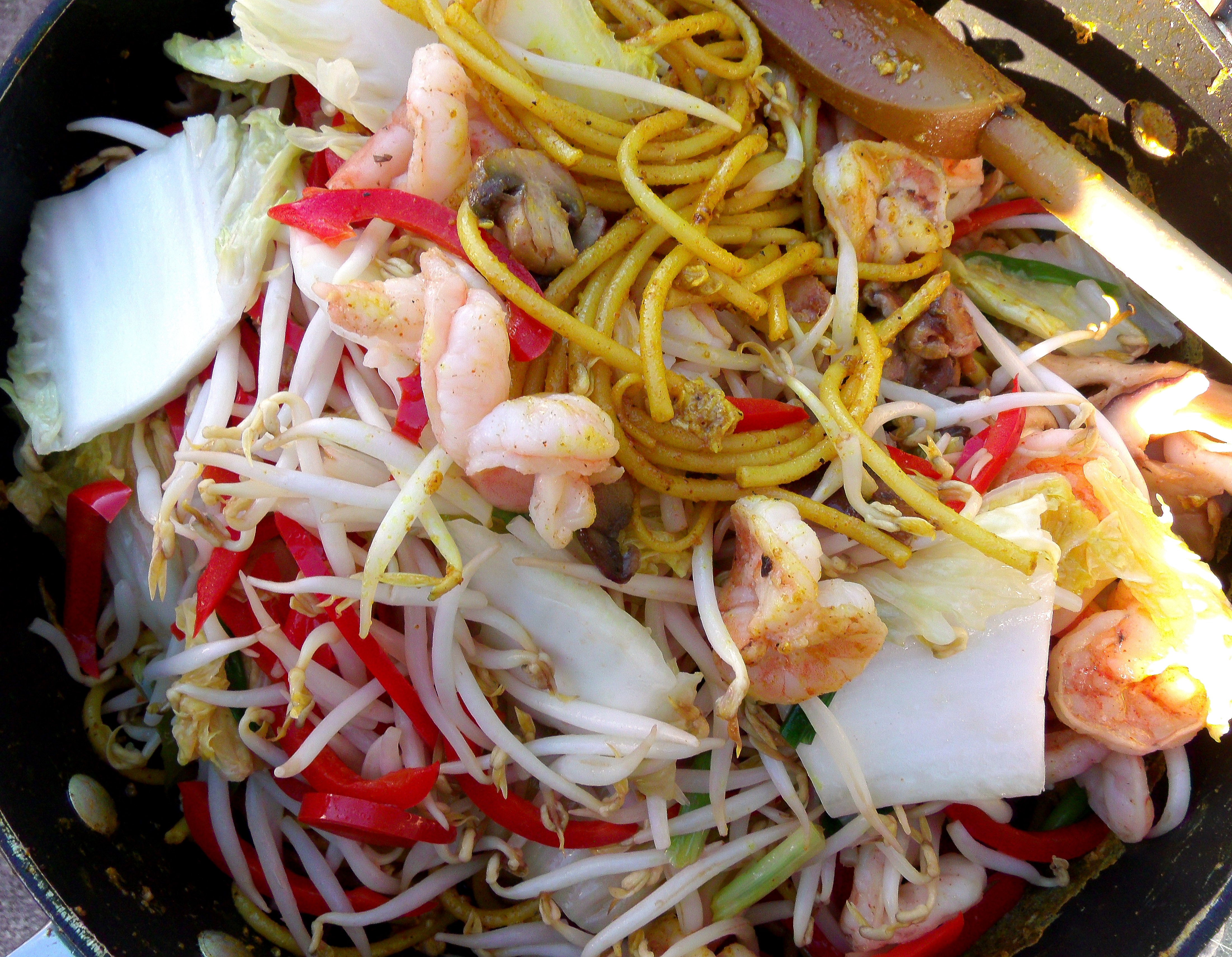 Curried Pasta With Shrimp, Mushrooms, Veggies And Egg ← Previous Next → add the shrimp, mushrooms and vegetables, mix well, check/adjust the seasoning; serves 4