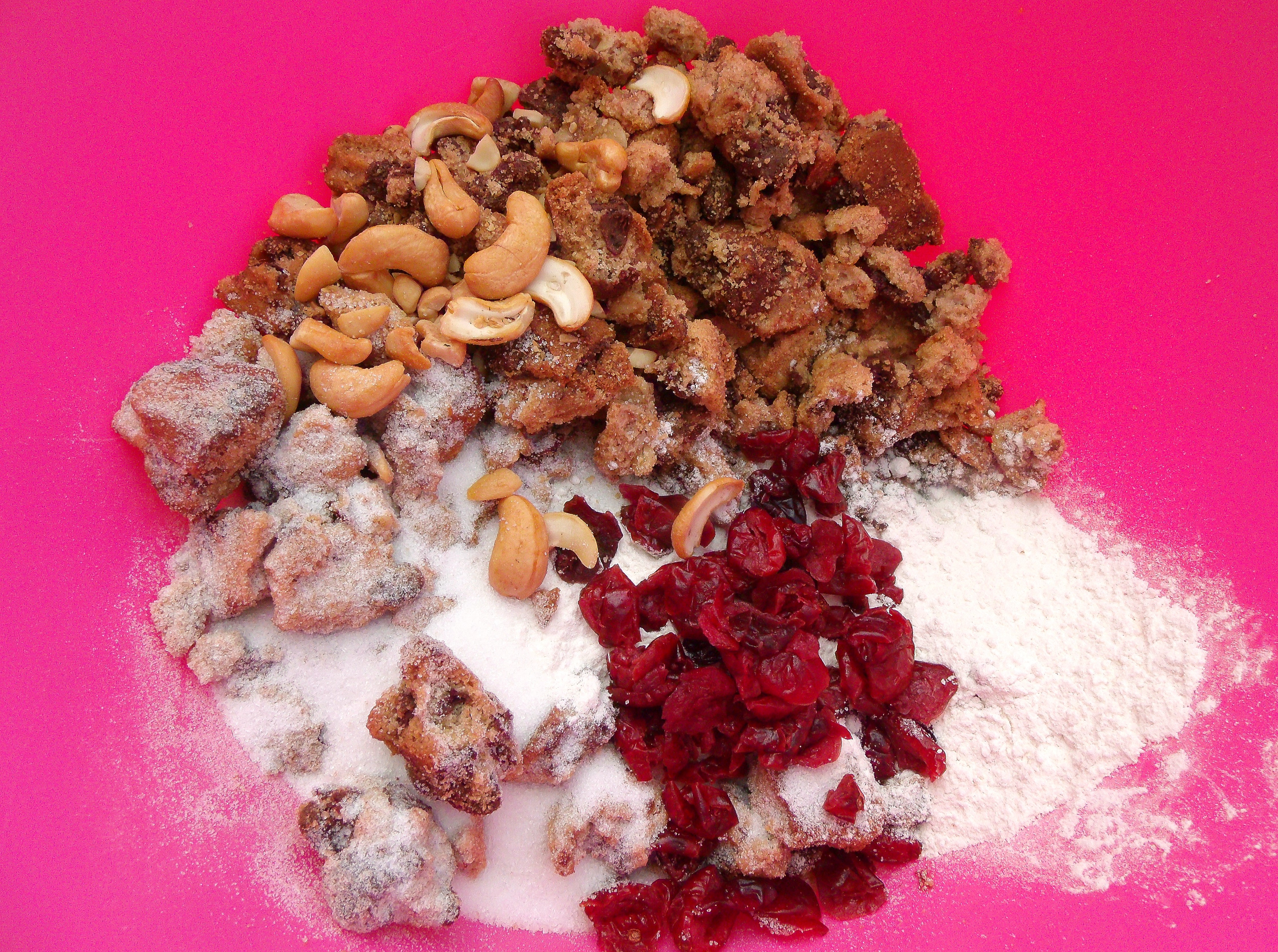 Caramelized Apple Cobbler With Twice Baked Chocolate Cookie Crumble Next → mix 10 med-sized, coarsely crumbled chocolate chip cookies with 1/2 tsp cinnamon powder, 1/4 cup a/p flour, 1/4 cup cashew nuts, 1/4 cup dried cranberries and 1/2 cup sugar