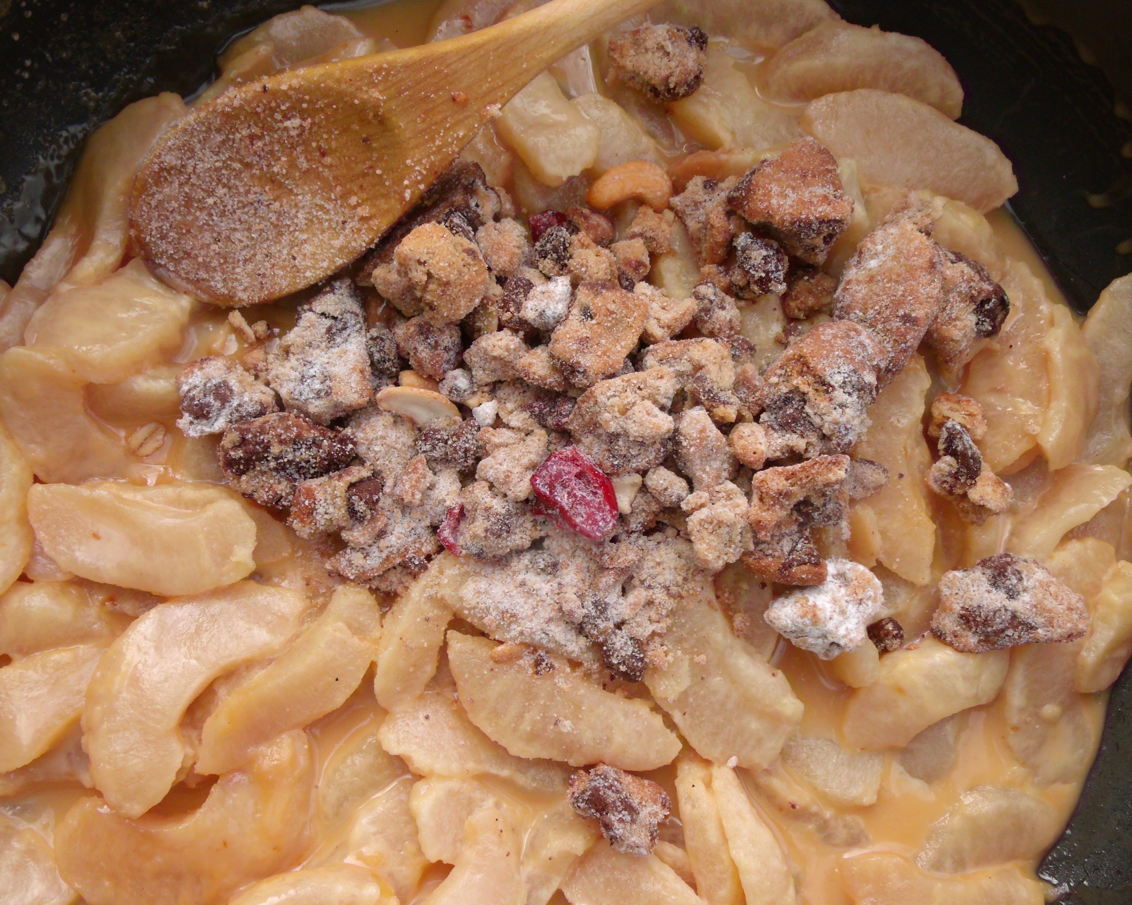 Caramelized Apple Cobbler With Twice Baked Chocolate Cookie Crumble ← Previous Next → remove from heat, add 1/5 of the crumble, mix well