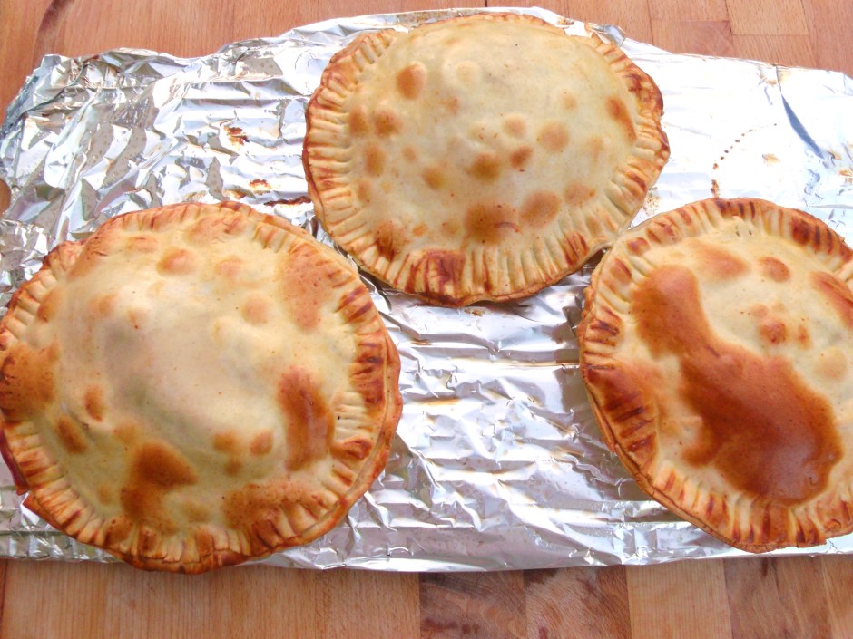 bake turnovers at 375F until dough is cooked through and crisp; serve with a side of marinated chilies or a green salad; serves 8 snacks or appetizers (to enjoy as main course, double the amount of filling; serves 4)