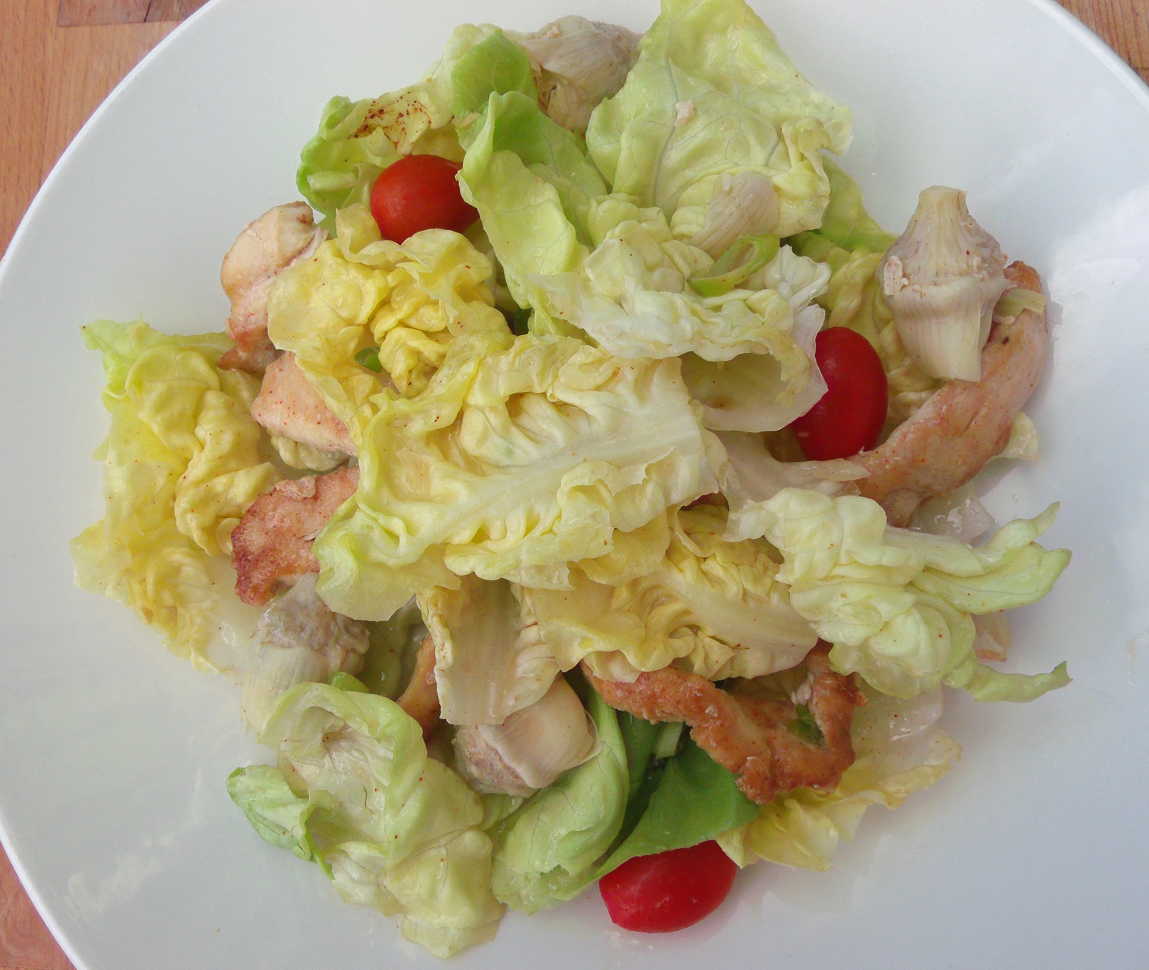 Butter Lettuce With Chicken, Artichokes And Grape-Tomatoes In White Balsamic Vinaigrette ← Previous Next → top with another layer of lettuce, then another layer of chicken, tomatoes and artichokes; serves 2