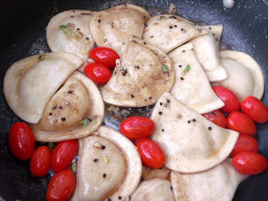 Potato And Onion Pierogi With Grape Tomatoes And Cracked Black Pepper In Beurre Noisette ← Previous Next → add 1 doz pierogies (depending on size) and fresh-cracked black pepper