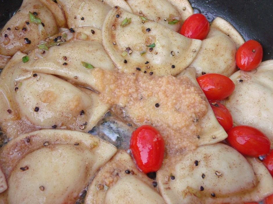 Potato And Onion Pierogi With Grape Tomatoes And Cracked Black Pepper In Beurre Noisette ← Previous Next → add garlic paste and kosher salt to taste