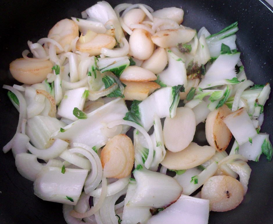 East Meets West – Sauteed Beef With Bok Choy, Onions And Potatoes In Hoisin Sauce ← Previous Next → add the cut whites of 1 lbs bok choy and julienne of 1 large onion, saute until onions are translucent