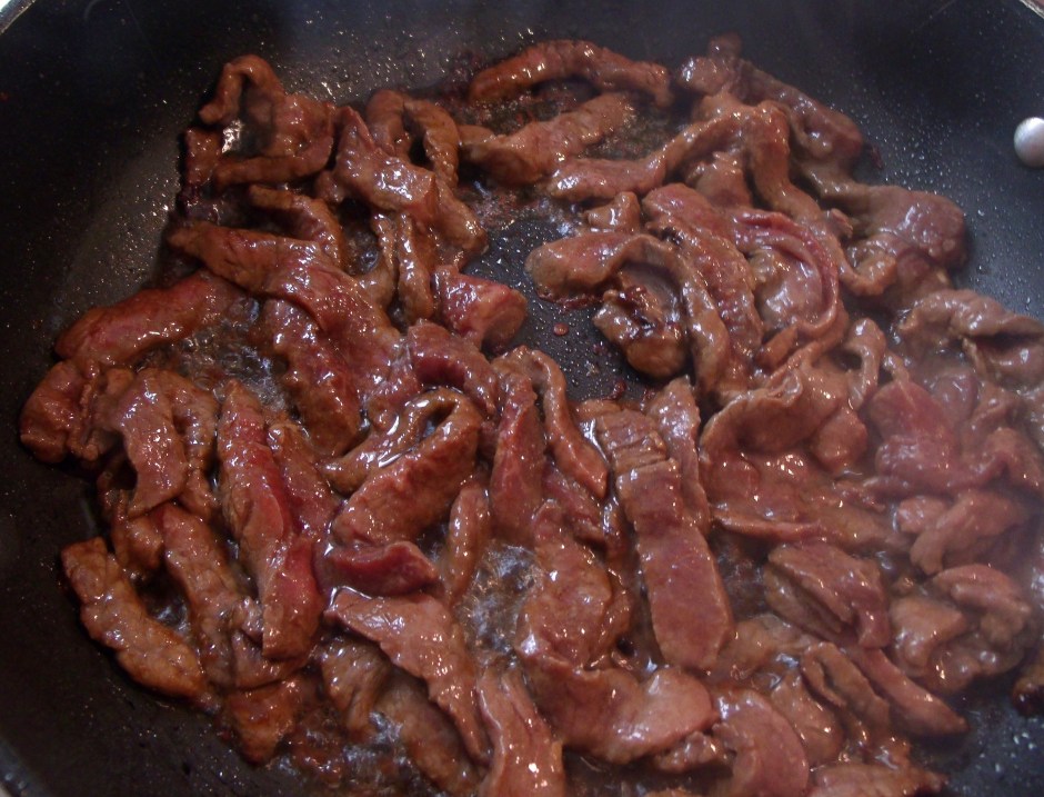 remove the beef from the marinade, add 1/2 cup water or stock to the marinade, reserve; saute (stir fry) the beef in 3 tblsp peanut oil at very high temperature, about 30 seconds