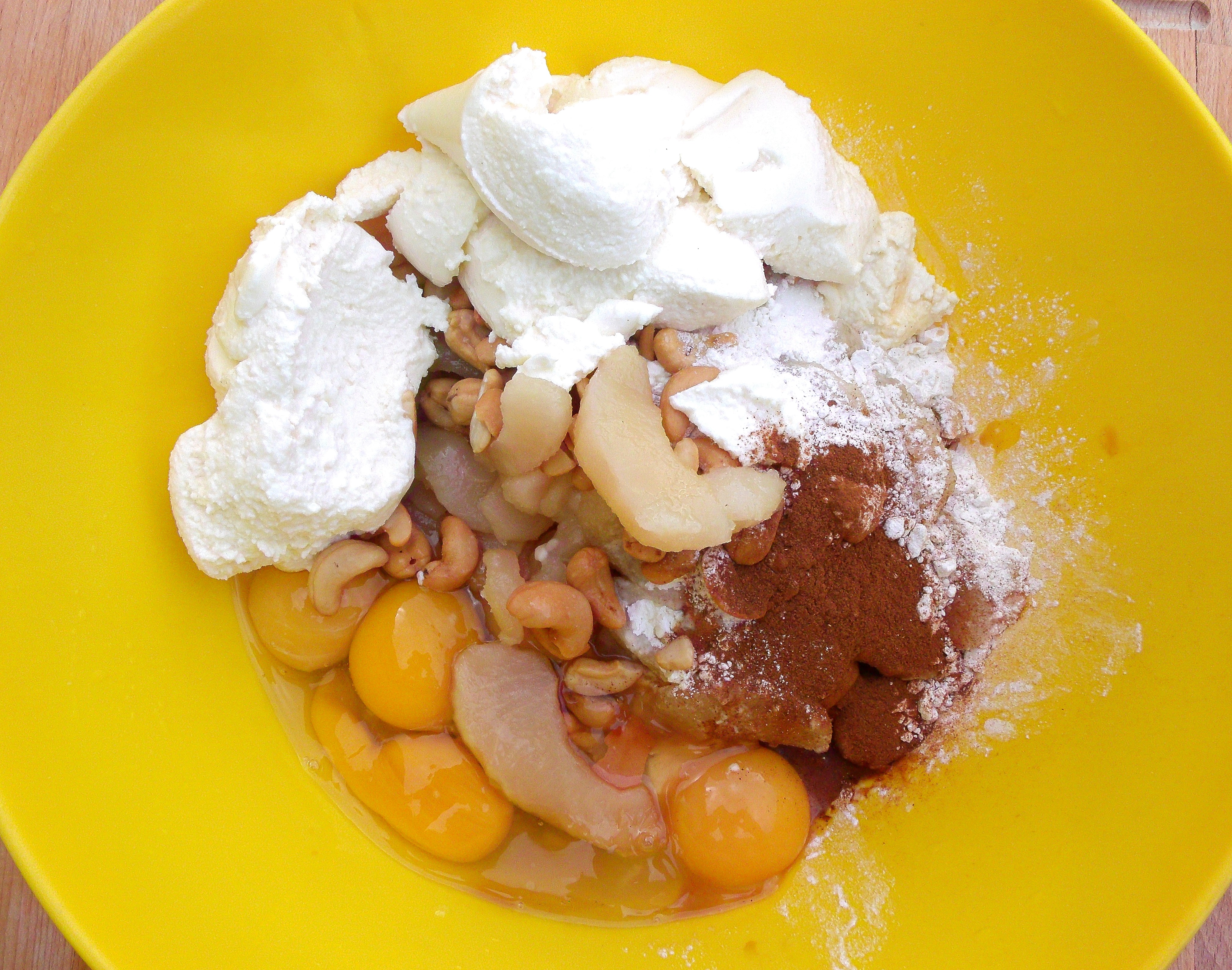 Ricotta Cheese Cake With Apples And Cashews, Served With Greek Yogurt And Pomegranate ← Previous Next → to the apples add 1/4 cup cashew nuts, 1 cup cottage cheese, 4 whole eggs, 3 tbls sugar, 1 tblsp grd cinnamon, 2 tblsp lemon juice, 1/2 tblsp vanilla extract