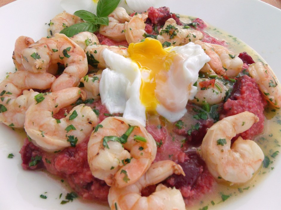 Red Beet Grits With Shrimp In Garlic/Herb Butter And Poached Egg ← Previous Next → Red Beet Grits With Shrimp In Garlic/Herb Butter And Poached Egg