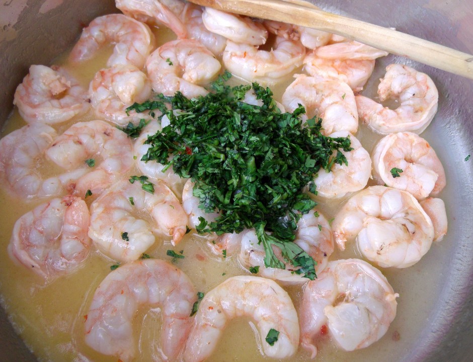 Red Beet Grits With Shrimp In Garlic/Herb Butter And Poached Egg ← Previous Next → saute until shrimp are almost cooked through , (carry-over heat will do the rest), add 1/4 cup chopped cilantro, check/adjust seasoning; serves 4