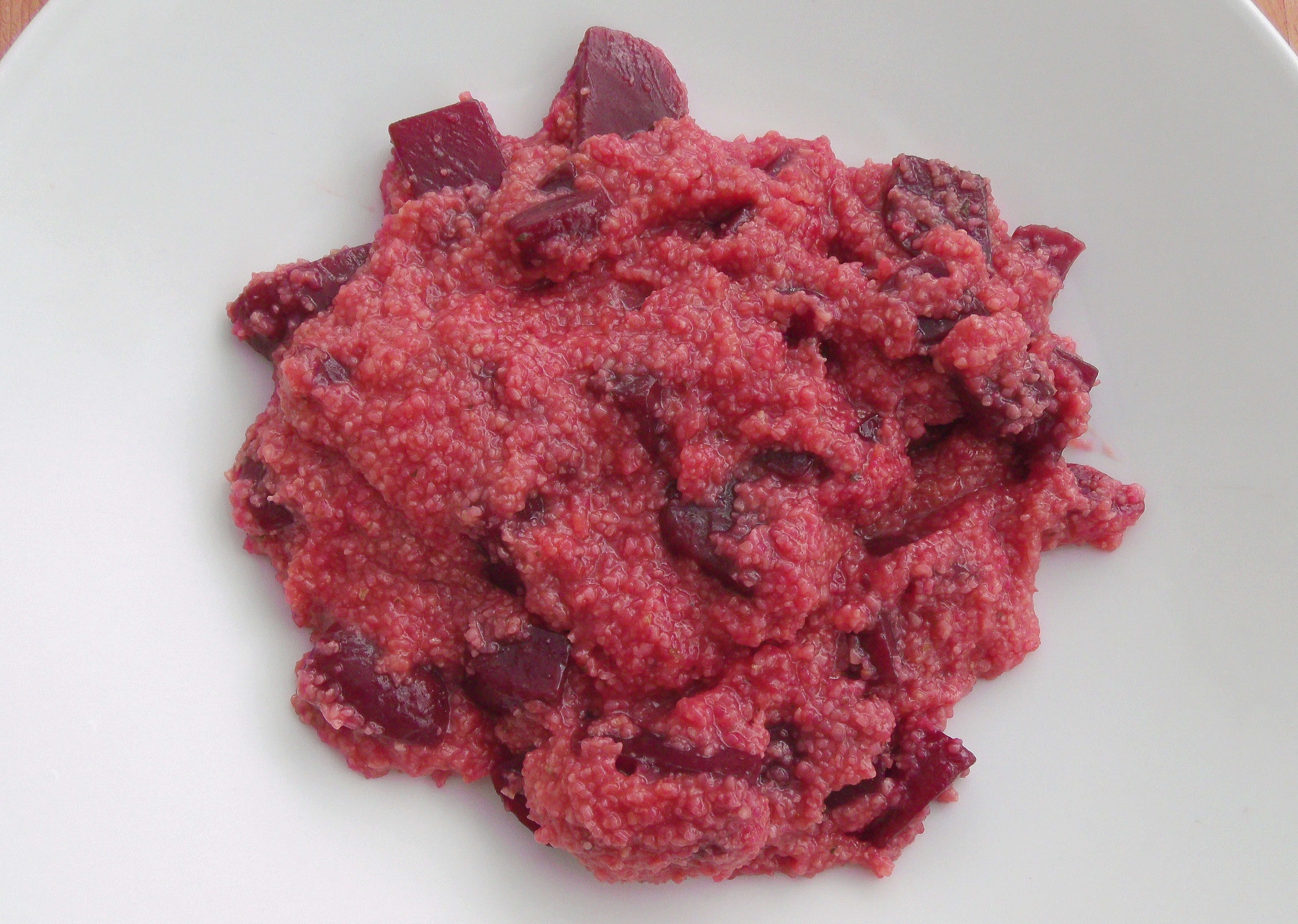 Red Beet Grits With Shrimp In Garlic/Herb Butter And Poached Egg ← Previous Next → plate grits in center of a deep serving plate