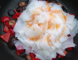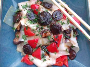 - saute 8 oz of reconstituted shiitake mushrooms and 1 large red pepper, cut into triangles, in 3 tblsp of peanut oil for 2 minutes, season with 1 tblsp garlic paste, 1/2 tsp grated ginger, 1 tblsp hoisin sauce, 1 tblsp soy sauce and kosher salt to taste