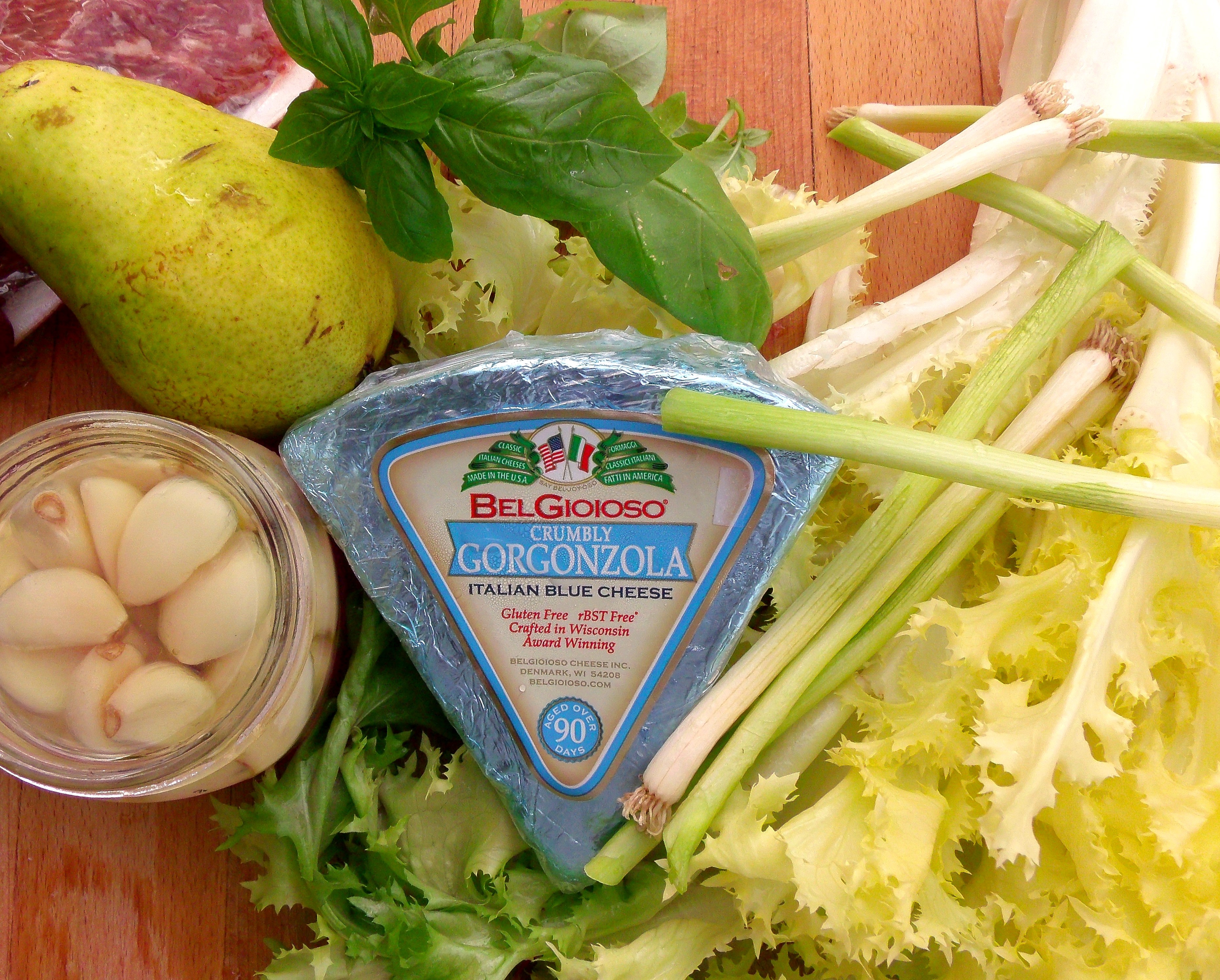 Steak Salad Recipe # 91 ← Previous Next → 1 ea pear-cut into batonnets, 10 oz gorgonzola-cut into slices, 6 ea scallion stalks- sliced, 8 ea whole garlic confit, 1 ea large endive (yellow only) -cut into pieces, 5 ea basil leaves-finely sliced (chiffonade)