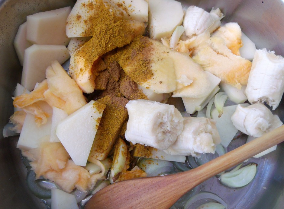 Curried Pumpkin, Potato And Coconut Soup ← Previous Next → add the flesh of 1 small pumpkin, 1 medium potato and 1 small banana, saute until the banana gets soft, add 3 tbslp curry powder, 1 pinch of ground cumin, kosher salt and cayenne pepper to taste