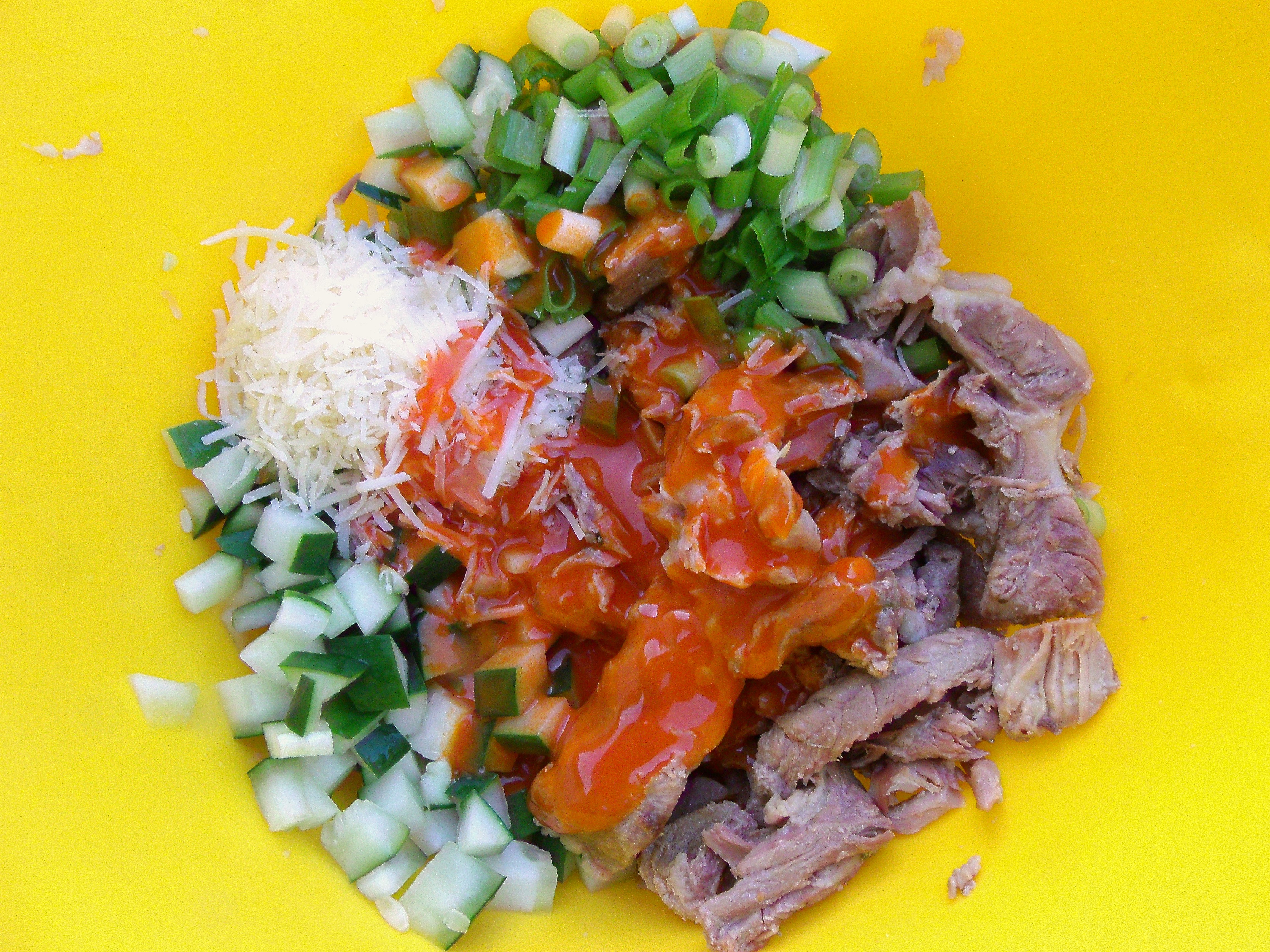 The Buffalo ← Previous Next → to the shredded pork add 1 medium size diced cucumber, 5 stalks sliced scallion, 1 tblsp panko, 2 tblsp shredded parmigiano reggiano and /2 cup Hans’s homemade buffalo sauce, mix together cup