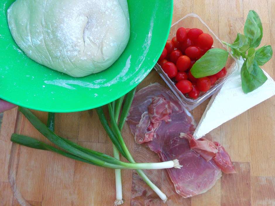Serrano-Ham And Brie-Cheese Bread Next → 1 lb pizza dough, 4 oz very finely sliced jamon serrano, fresh basil chiffonade, a handful of grape tomatoes, 10 oz diced brie cheese, 4 stalk sliced scallions, 1/2 tsp dried oregano