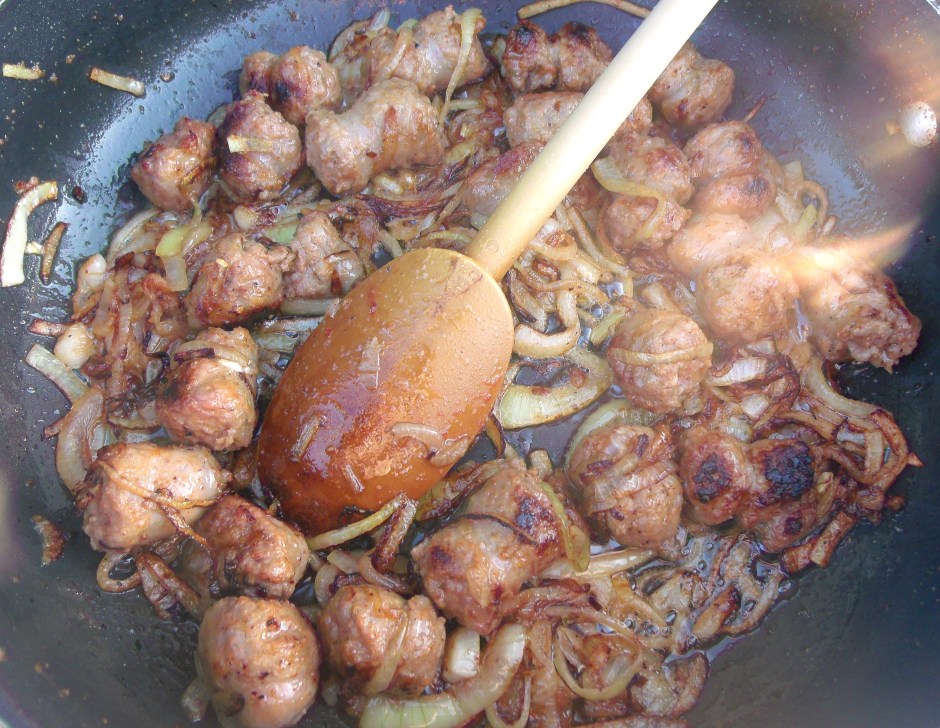 Spaghetti With Cabbage, Peppers And Gorgonzola ← Previous Next → saute until the onions are lightly caramelized and the sausages are cooked through