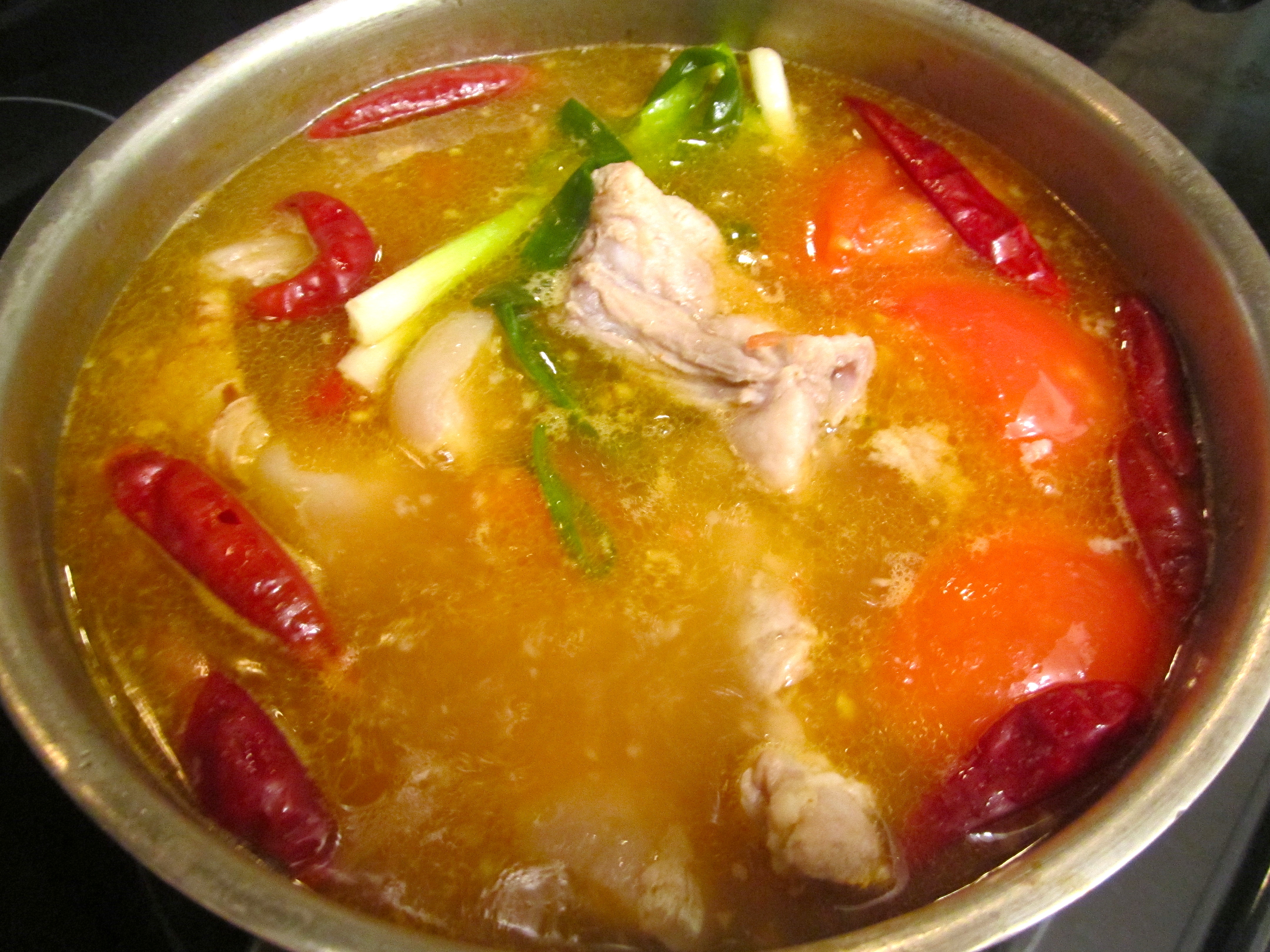 simmer all until pork is tender but NOT falling apart, remove pork, set aside, strain soup into a new pot, season the soup with the souring agent of your choice (I used tamarind juice), add the pork back into the soup, add the vegetables of your choice