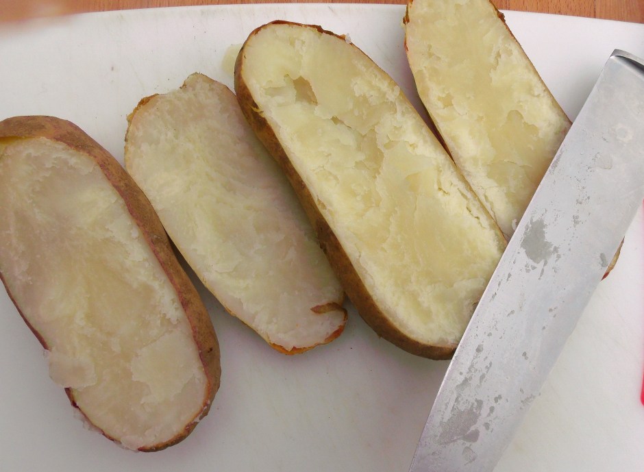 Twice Baked Shepherd’s Potatoes ← Previous Next → in a 400F oven, bake 2 large russet potatoes until cooked through, remove from oven, cut -off the tops, remove the flesh, discard the empty tops