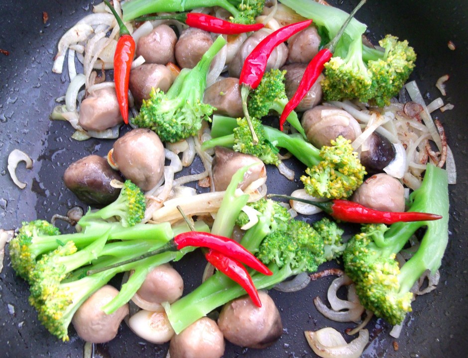 Flaming Hot Chili Chicken Noodle Bowl With Broccoli And Straw Mushrooms ← Previous Next → add 7 ea hot chilies, 1 can drained straw mushrooms and 16 oz blanched broccolini