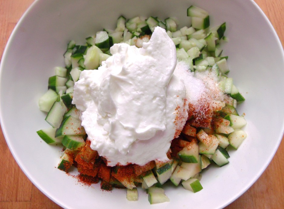for the Mast-o klar, cut 2 small cucumbers around the seeds, discard seeds, cut flesh into small dice, add 1 tsp grated onion, 1 pinch grated garlic, 1/2 tsp finely sliced dill leaves, 1/3 cup Greek yogurt, season with cayenne pepper, kosher salt and ground cumin to taste, mix well, check/adjust seasoning; serve as a side dish or topping for the baked potatoes