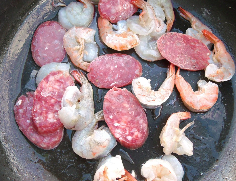 Stir Fried Rice Flakes With Shrimp And Spicy Sausage ← Previous Next → stir fry 10 thin slices of spicy sausage of your choice, 1 lb med size shrimp, tail-on, peeled and de-veined in 3 tblsp peanut oil until shrimp are half-done