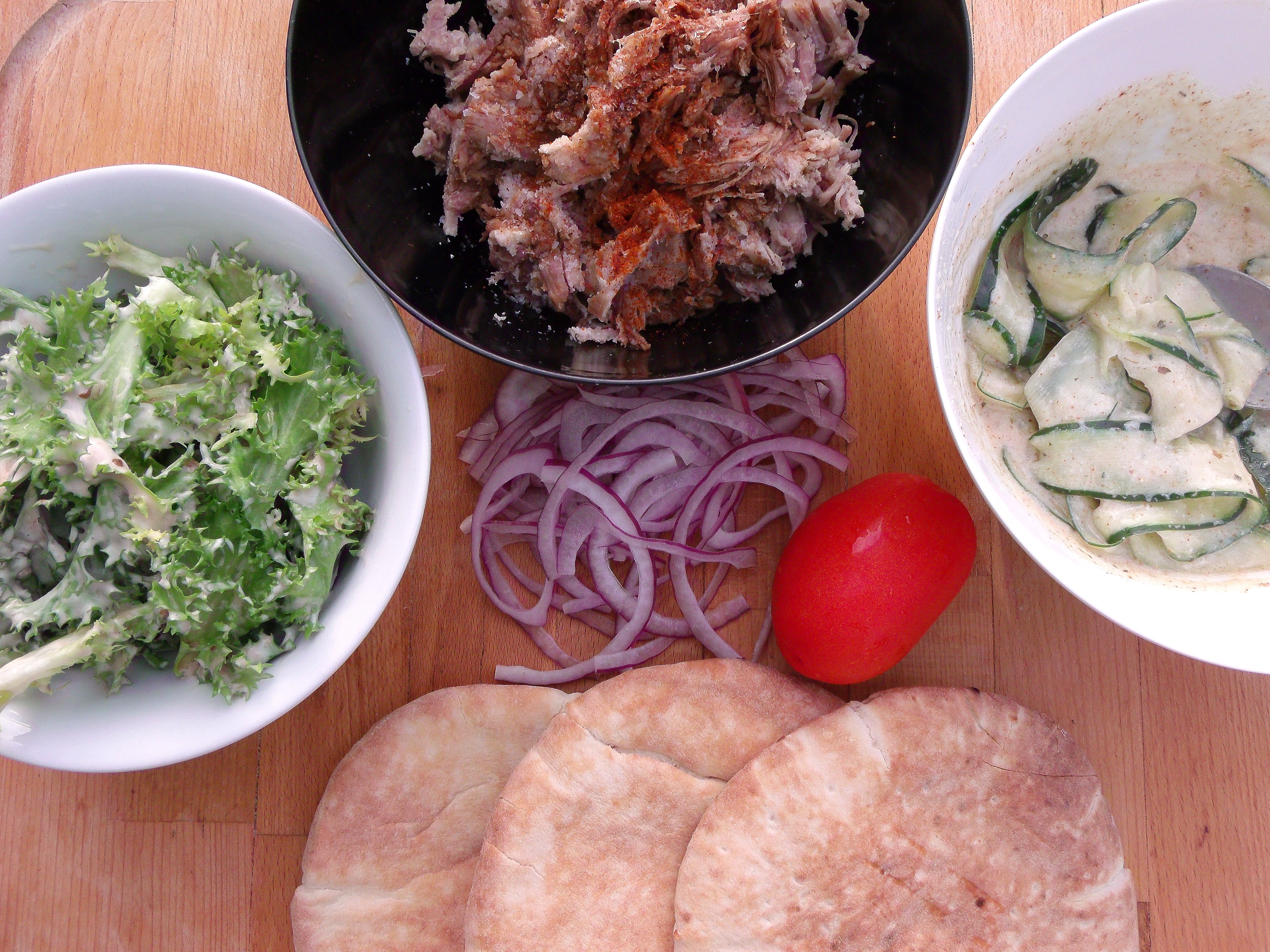 Greek Lamb Sandwich ← Previous Next → season some green leaves with honey/yogurt dressing, toast 3 ea pita breads, slice 1 ea tomato and 1/2 red onion, assemble as shown in the following pics