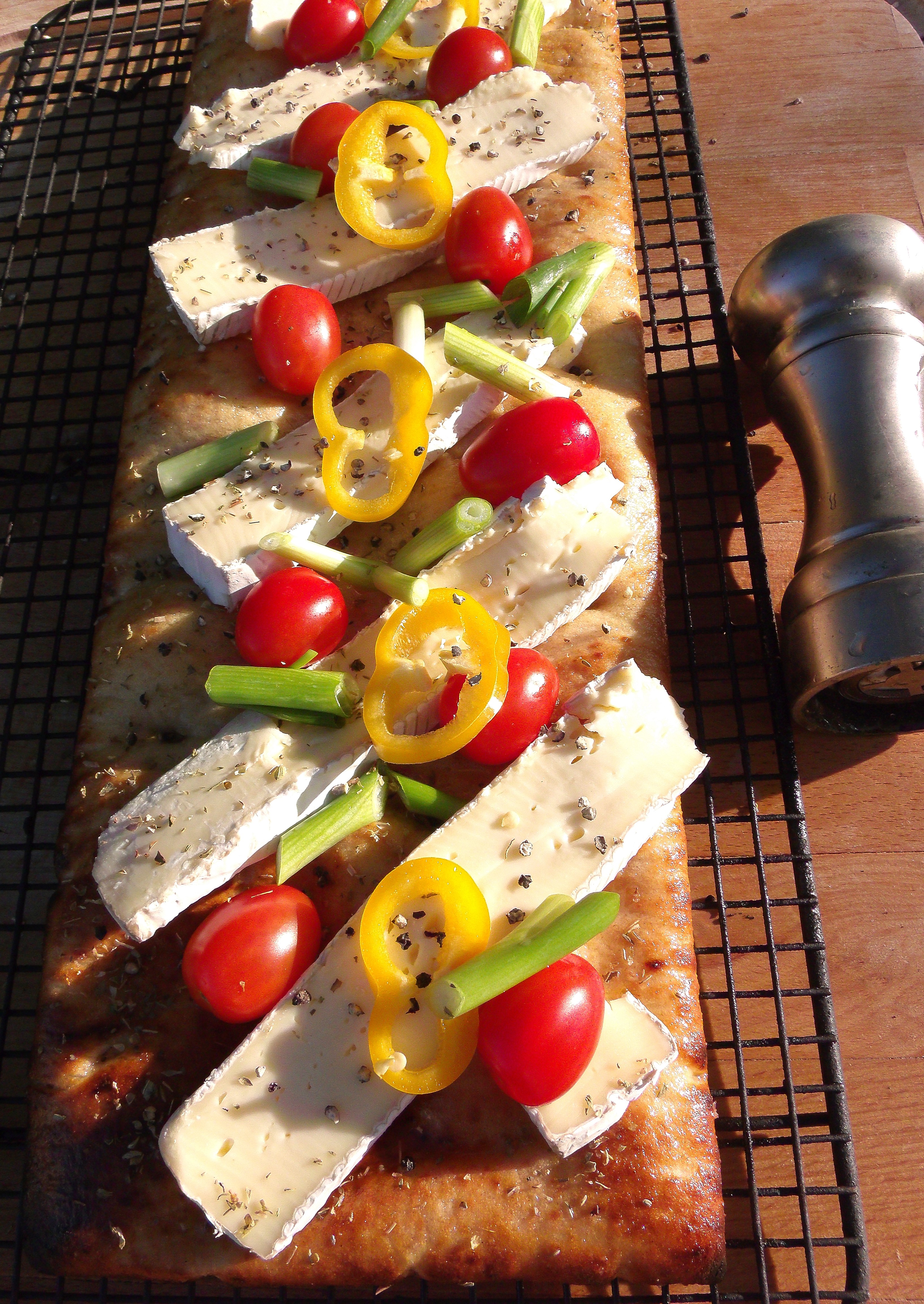Easy Does It # 33 – Brie and Capocollo Pie ← Previous Next → top with sliced brie, scallion, mild chilies and grape tomatoes, sprinkle with fresh-ground black pepper and fresh or dried oregano