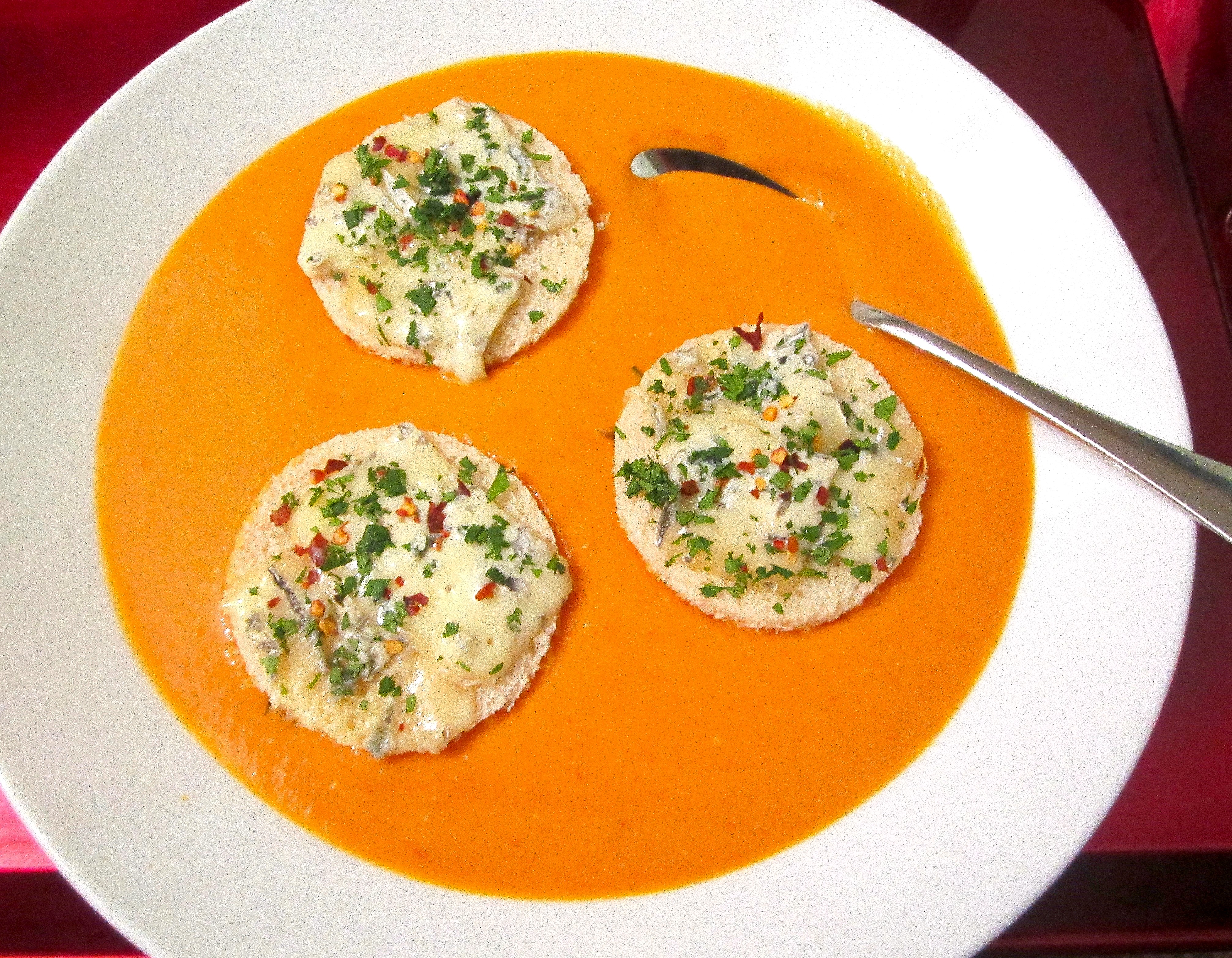 Tomato Bisque with Gorgonzola Croûton