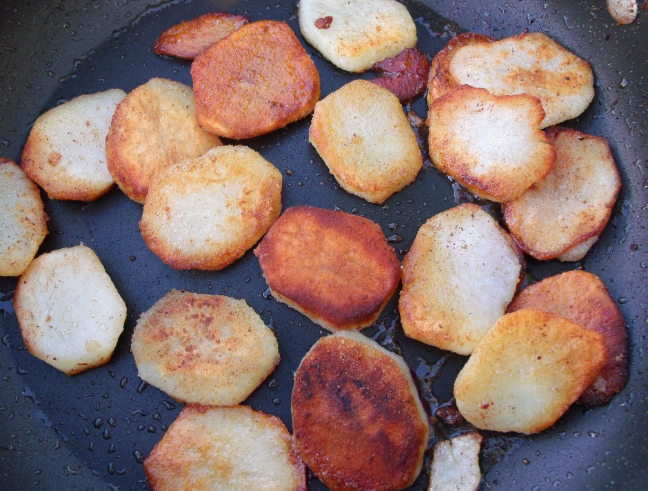 Bone-In Rib Eye With Sauteed Potatoes And Brussel Sprouts ← Previous Next → saute potato slices in garlic oil until golden and crisp, season with kosher salt and cayenne pepper