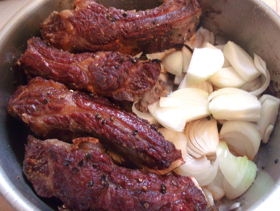 Braised Beef Back Ribs With Glazed Baby Rainbow Carrots ← Previous Next → add 3 large corse-chopped onions, saute until onions are well caramelized
