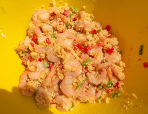 So last week when I went to the store to buy shrimp for this dish, these small salad shrimp for $7.75 a pound seemed more suitable than the large ones for $28.00 a pound. (My wallet insisted). I had planned to chop the shrimp, then add peppers, seasoning and an egg white and prepare shrimp cakes in the traditional way. However, these here babies with the tiny cooked shrimp turned out to be just as good, perhaps even better. The texture is of course very different from patties made from chopped raw shrimp, but as I said, not inferior, and maybe even better.