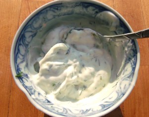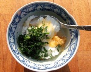 - 1 cup of Greek yogurt, 1 tblsp honey, juice of 1 lime, 1/4 tsp garlic paste, 2 tblsp dill leaves, kosher salt and white pepper to taste