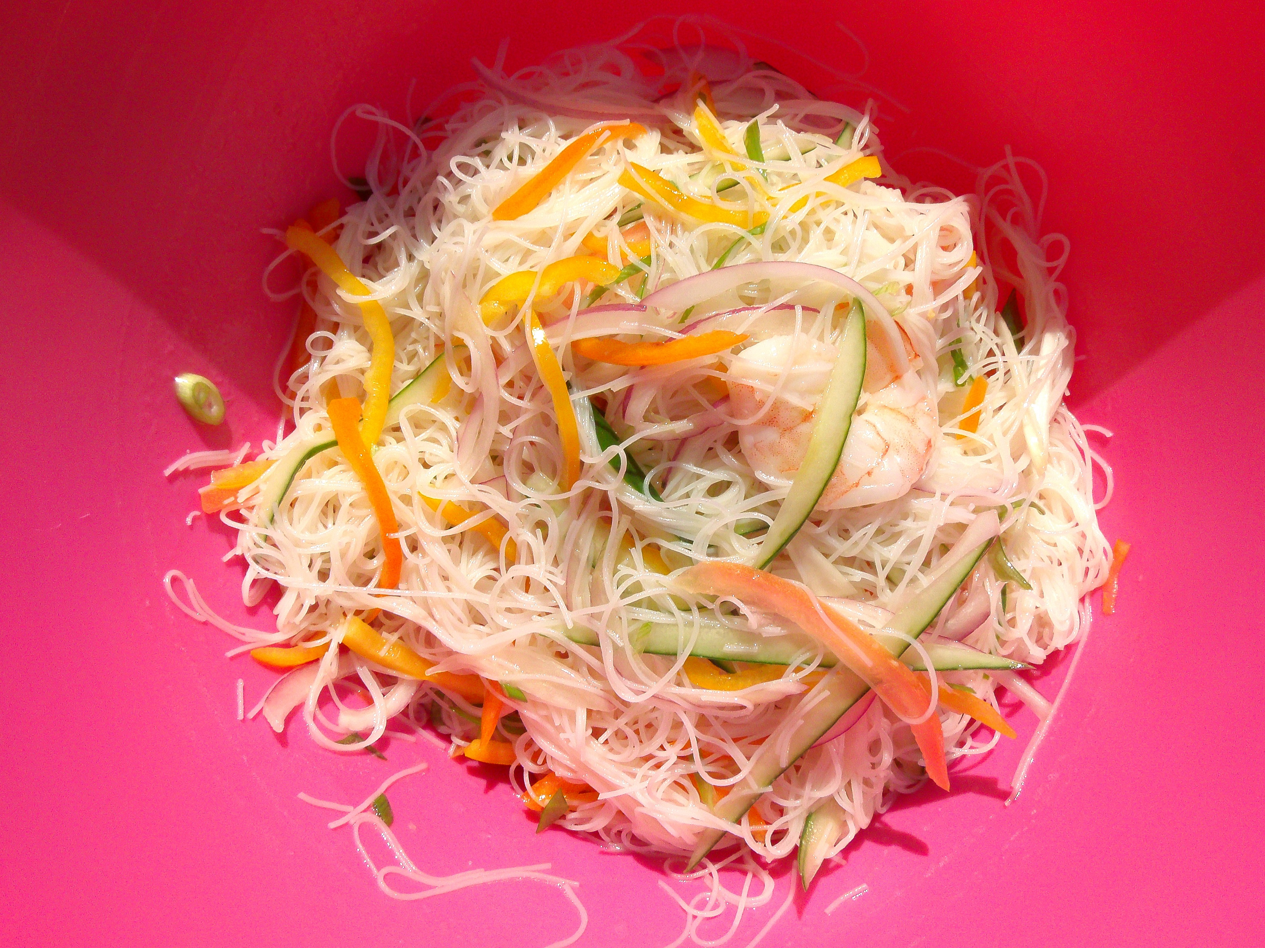 soak 8 oz rice sticks in hot water until soft, drain, mix with the shrimp (reserve 12 halves for garnish, 2 inside the rool and one on top), fine julienne of 1/4 red pepper and 1/4 yellow pepper, fine julienne of 1/4 red onion and 3 ea finely sliced basil leaves, dress with rice vinegar, fish sauce, chili pepper, kosher salt and sesame oil to taste