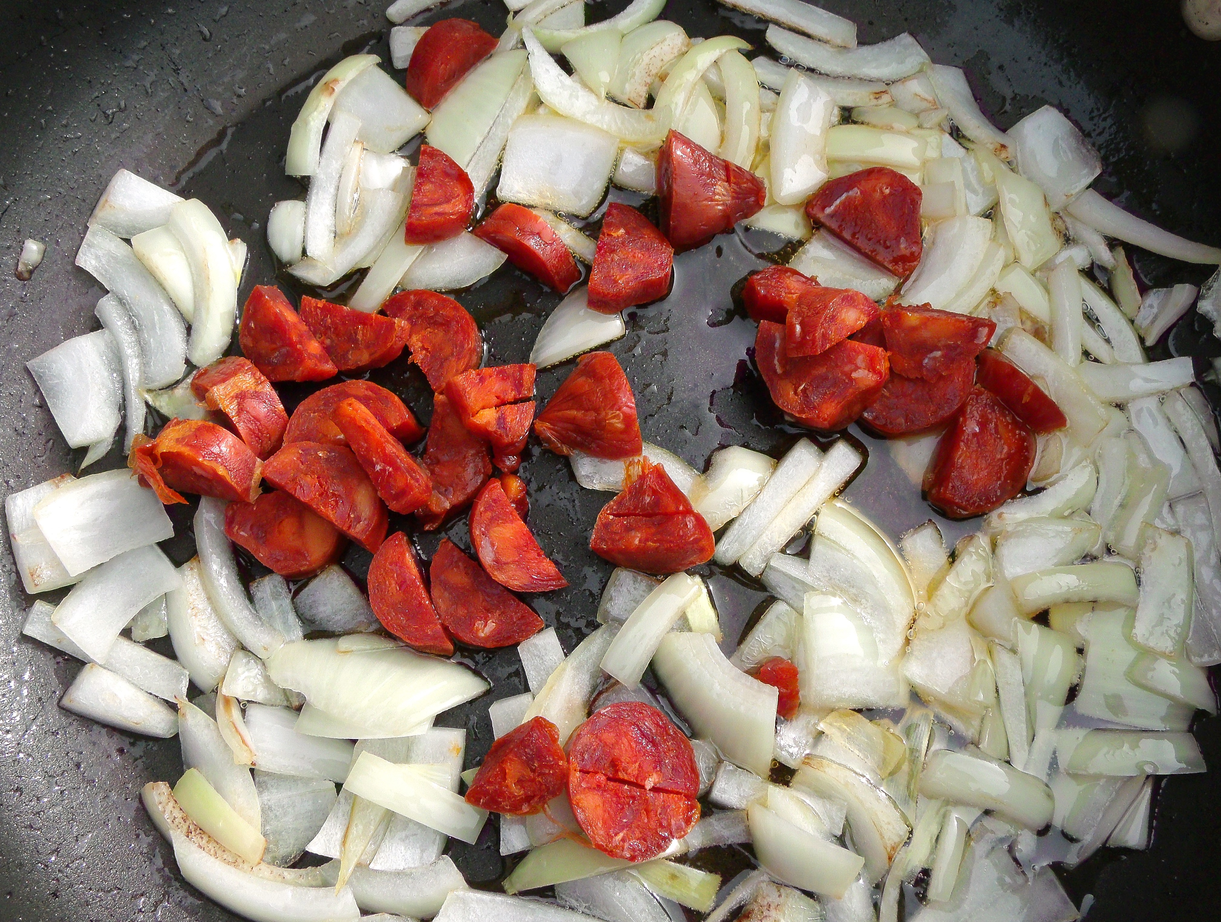 Falscher Hase (Fake Rabbit) (Meatloaf) ← Previous Next → saute 6 once coarsely diced chorizo and 1 ea coarsly diced onion in 4 oz EVO until onions are translucent