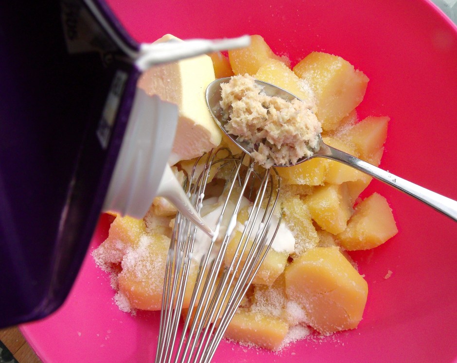 Falscher Hase (Fake Rabbit) (Meatloaf) ← Previous Next → peel, cut and cook 2 lbs potatoes until soft, drain, add 6 oz whole butter, 2 oz grated horseradish, kosher salt to taste and 4 tblsp heavy cream, mash until purre texture is achived (add more cream if needed)